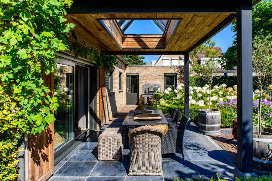 Vanuit de woonkamer is een zichtlijn gemaakt de achtertuin in zodat de bewoners hier het hele jaar van kunnen genieten.